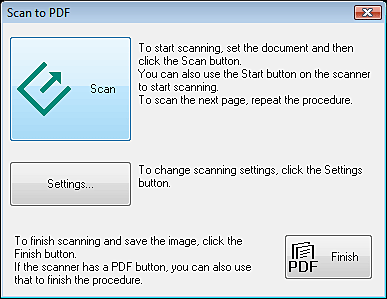 Po dokončení klepněte na tlačítko Finish (Dokončit) nebo stiskněte tlačítko  Scan to PDF (Skenovat do PDF) na skeneru. Dokument je uložen jako soubor PDF ve složce Pictures nebo My Pictures případně v místě, které jste nastavili v okně File Save Settings (Možnosti uložení souboru).