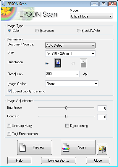 Skenování v režimu Office Mode (Kancelářský režim)Při prvním spuštění se aplikace Epson Scan spustí v režimu Office Mode (Kancelářský režim) a zobrazí se okno Office Mode (Kancelářský režim) aplikace Epson Scan.