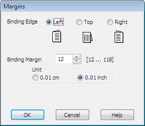 V nastavení Unit (Jednotka) vyberte možnost cm nebo inch (palec). Potom zadejte šířku okraje pro vazbu. Lze zadat hodnotu v rozmezí od 0,3 do 3,0 cm nebo od 0,12 do 1,18 palců.
