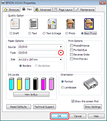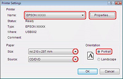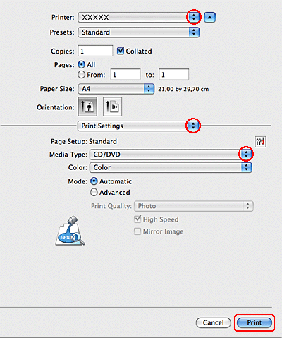 Software Epson Print CD dodaný s tiskárnou umožňuje vytvářet potisky disků CD/DVD. Po vytvoření souboru s potiskem můžete tisknout přímo na 12cm a 8cm disky CD/DVD.
