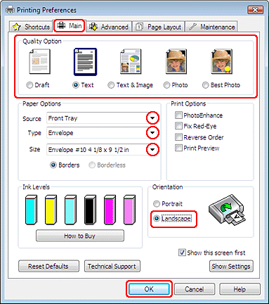 Vyberte používanou tiskárnu jako nastavení Printer (Tiskárna) a potom vyberte vhodnou velikost obálky jako nastavení Paper Size (Velikost papíru). Můžete také definovat vlastní velikost obálky. Podrobnosti najdete v elektronické nápovědě.