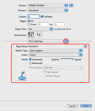 Proveďte příslušná nastavení položek Media Type (Typ média), Color (Barva) a Mode (Režim). Podrobnosti o nastavení Print Settings (Nastavení tisku) najdete v nápovědě.
