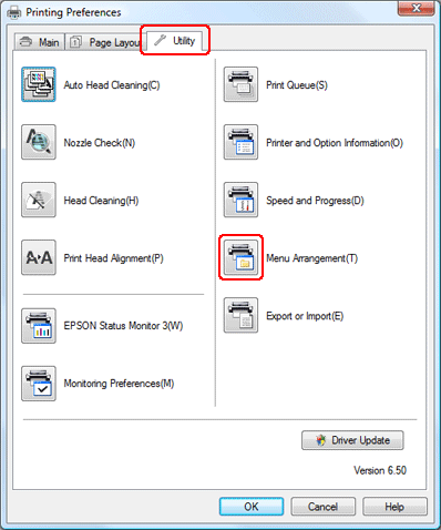 Klepněte na kartu Utility (Nástroj) a klepněte na možnost Menu Arrangement (Uspořádání nabídky).