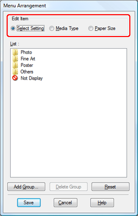 Otevřete okno Saves or Deletes Select Settings (Uloží nebo vymaže vlastní nastavení) nebo Saves or deletes Custom Media (Uloží nebo vymaže vlastní média).