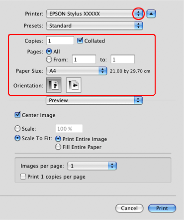 Vyberte používanou tiskárnu jako nastavení Printer (Tiskárna) a vyberte požadovaná nastavení.