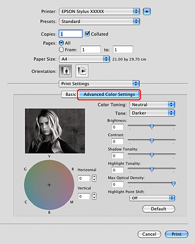 Klepněte na možnost Custom (Vlastní) v rámci nastavení Mode (Režim), vyberte možnost Color Controls (Ovl. prvky pro barvy) a klepněte na položku Advanced (Upřesnit).