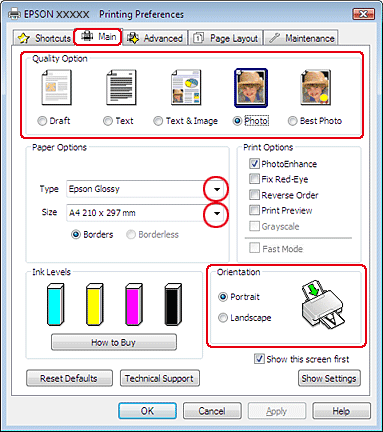 Klepněte na kartu Main (Hlavní) a vyberte jedno z následujících nastavení Quality Option (Typ kvality):
