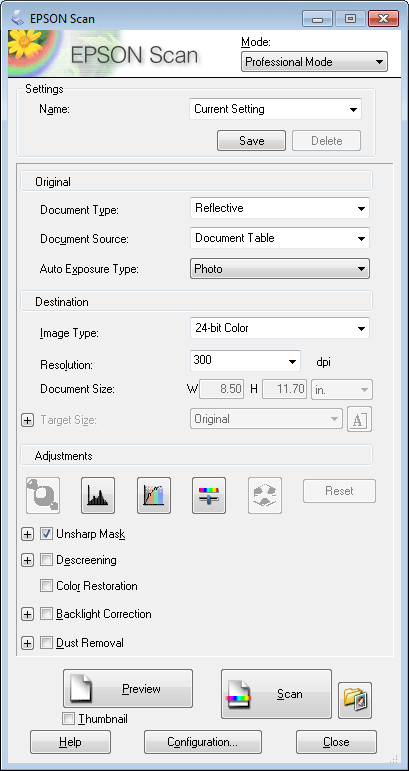 Professional Mode (Profesionální režim) poskytuje úplnou kontrolu nad funkcemi skenování společně s možností ověření provedených změn v okně náhledu. Tento režim se doporučuje pro pokročilé uživatele.
