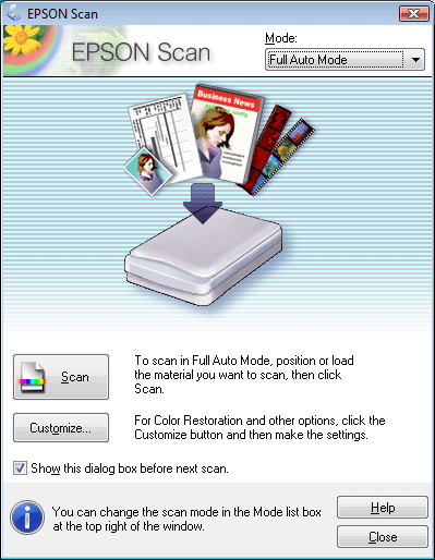 Når du starter Epson Scan første gang, kører programmet i Full Auto Mode (Fuldautomatisk tilstand) og viser vinduet Epson Scan Full Auto Mode (Fuldautomatisk tilstand).