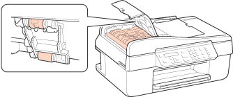 Åbn ADF-dækslet, og brug en blød, tør og ren klud til at rengøre rullen og ADF'ens indre.