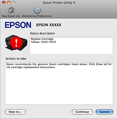 Hvis blækniveauet er lavt, eller patronen er tom, vises der en How to (Sådan)-knap. Klik på How to (Sådan), så hjælper EPSON Status Monitor 3 dig gennem proceduren med at udskifte patroner trin for trin.