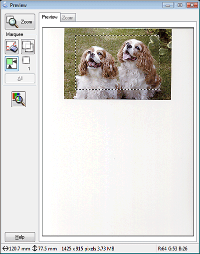 Hvis du vil zoome ind på et billede, skal du klikke inde i scanningsområdet og klikke på knappen Zoom. Epson Scan udfører en indledende scanning igen og viser et større eksempel under fanen Zoom.