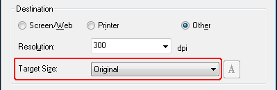 Hvis du vil scanne billedet til en bestemt størrelse, skal du vælge indstillingen Target Size (Målstørrelse) efter at have gennemset billedet, men før du justerer scanningsområdet (angives ved oprettelse af en markeringsramme). Dette indstiller scanningsområdet til de korrekte mål, så billedet ikke beskæres på uventet måde.
