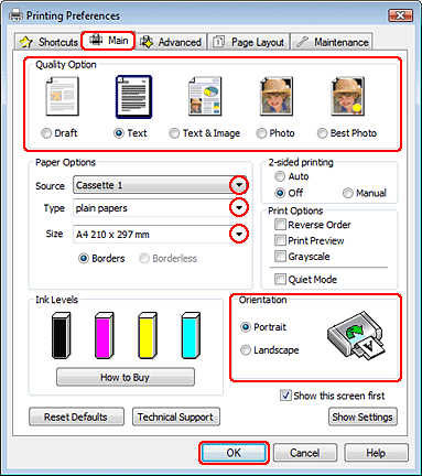 Afhængig af dit program kan du muligvis ikke vælge nogle af punkterne i denne dialogboks. Hvis det er tilfældet, skal du klikke på Page Setup (Sidelayout) i menuen File (Arkiv) i dit program og derefter foretage de passende indstillinger.