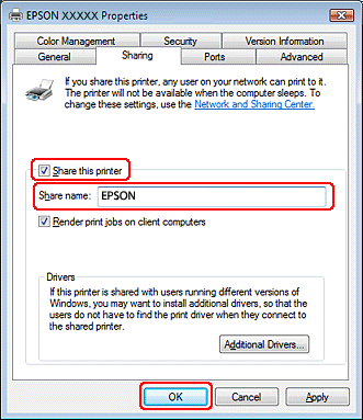 ![]() Hvis du automatisk vil hente printerdrivere til computere, der kører andre versioner af Windows, skal du klikke på Additional Drivers (Yderligere drivere). Klik på OK, og læg derefter cd'en med printersoftwaren i cd-rom-drevet.