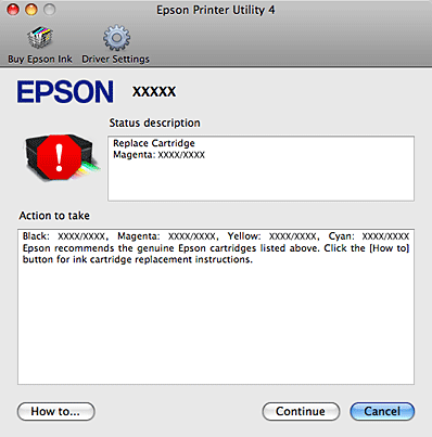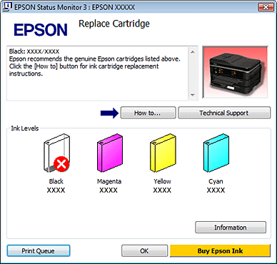![]() Hvis blækniveauet er lavt, eller patronen er tom, vises en How to (Sådan)-knap. Klik på How to (Sådan), hvorefter EPSON Status Monitor hjælper dig gennem proceduren for udskiftning af blækpatroner trin for trin.