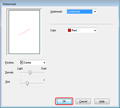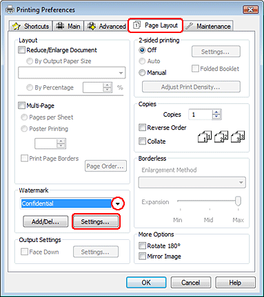 Watermark (Vandmærke) gør det muligt at udskrive et tekst- eller billedbaseret vandmærke på dokumentet.