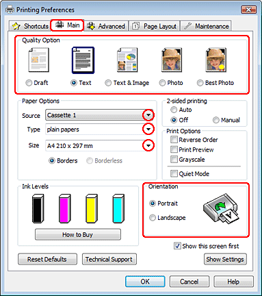 Klik på fanen Main (Hovedmenu), og vælg derefter en af følgende indstillinger for Quality Option (Kvalitetsindstillinger):