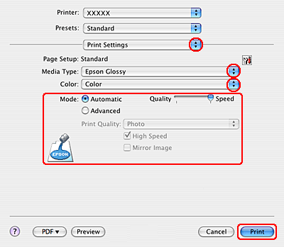 Vælg de ønskede indstillinger for Media Type (Medietype), Color (Farve) og Mode (Tilstand). Yderligere oplysninger om Print Settings (Udskriftsindstillinger) finder du i online Hjælp.