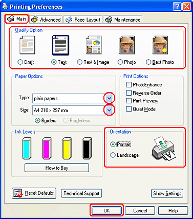Klik på fanen Main (Hovedmenu), og vælg derefter en af følgende indstillinger for Quality Option (Indstilling for kvalitet):