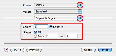 Vælg den printer, du bruger, som indstilling for Printer. Vælg derefter indstillinger for Copies & Pages (Kopier og sider).