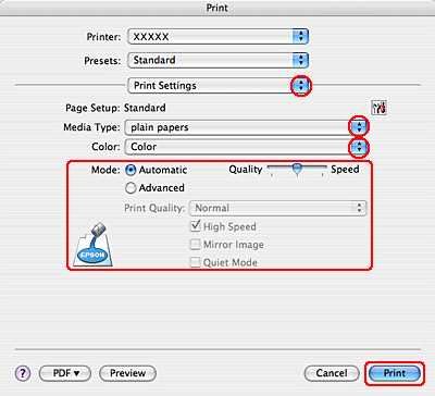 Vælg de ønskede indstillinger for Media Type (Medietype), Color (Farve) og Mode (Tilstand). Yderligere oplysninger om Print Settings (Udskriftsindstillinger) finder du i online Hjælp.