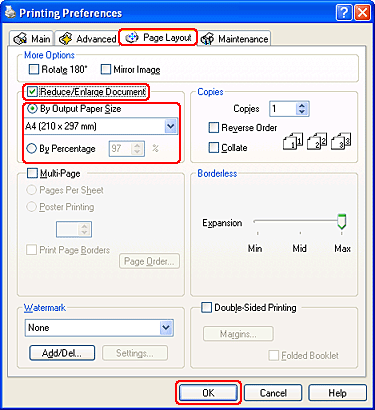Klik på fanen Page Layout (Sidelayout), og marker derefter afkrydsningsfeltet Reduce/Enlarge Document (Reducer/forstør dokumentet).
