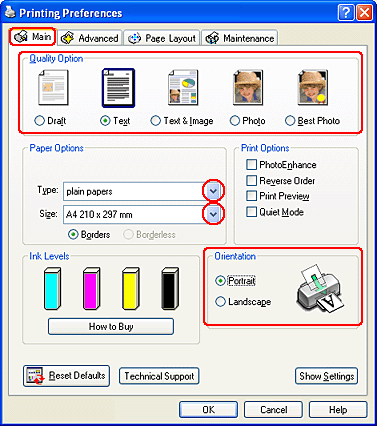 Klik på fanen Main (Hovedmenu), og vælg derefter en af følgende indstillinger for Quality Option (Indstilling for kvalitet):