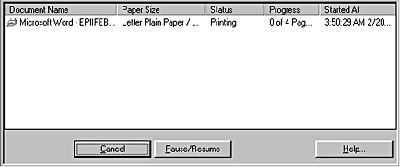 Når et udskriftsjob når frem forrest i køen, sender EPSON Spool Manager jobbet til printeren. Du kan annullere udskriftsjob fra Spool Manager. Du kan også få vist statusoplysninger for udskriftsjob, og du kan afbryde udskrivningen midlertidigt (pause) og genoptage eller genstarte den.