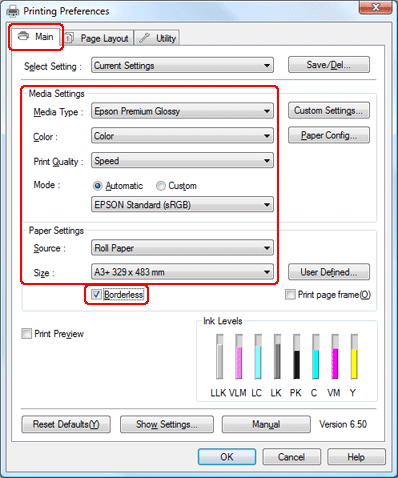 Vælg Roll Paper (Papirrulle) som indstilling for Source (Kilde).