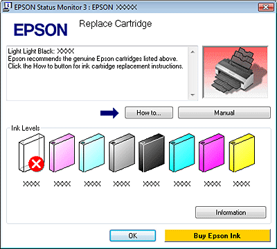 Hvis blækniveauet er lavt, eller patronen er tom, vises en How to (Sådan)-knap. Klik på How to (Sådan), hvorefter EPSON Status Monitor 3 fører dig gennem proceduren for udskiftning af patroner trin for trin.