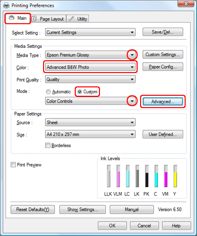 Klik på Custom (Tilpasset) som Mode (Tilstand), og vælg Color Controls (Farveindstillinger), og klik derefter på Advanced (Avanceret).