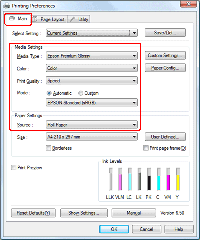 Vælg Roll Paper (Papirrulle) som indstilling for Source (Kilde).