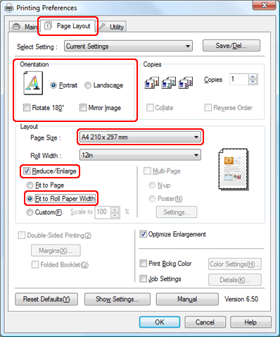 Vælg Reduce/Enlarge (Formindsk/forstør), og klik derefter på Fit to Roll Paper Width (Tilpas til papirrullens bredde).