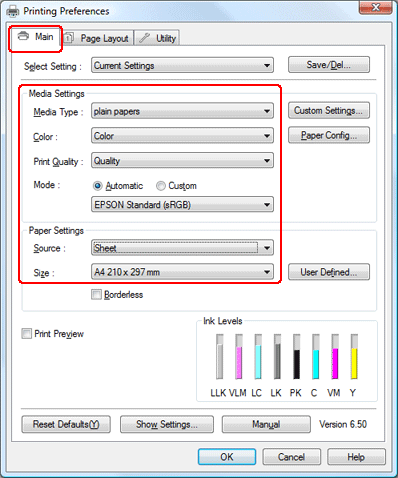 Klik på fanen Main (Hovedmenu), vælg den ønskede indstilling for Media Type (Medietype), og vælg derefter dine foretrukne emner for indstillingerne Color (Farve), Print Quality (Udskriftskvalitet) og Mode (Tilstand).