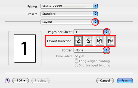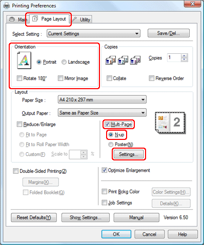 Klik på fanen Page Layout (Sidelayout), vælg Portrait (Stående) (højt) eller Landscape (Liggende) (bredt) for at ændre udskriftsretningen, og vælg derefter Multi-Page (Flere sider), vælg derefter N-up (N-op).