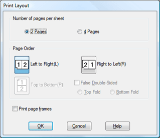 Klik på Settings (Indstillinger) for at åbne vinduet Print Layout (Udskriftslayout). Angiv den rækkefølge, siderne skal udskrives i, i vinduet Print Layout (Udskriftslayout). Marker afkrydsningsfeltet Print page frames (Udskriv siderammer) for at udskrive rammer omkring de sider, der udskrives på det enkelte ark.