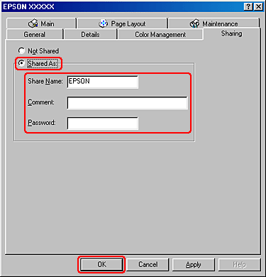 Vælg Shared As (Delt som), indtast oplysningerne om printeren, og klik på OK.