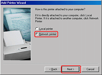 Vælg Network printer (Netværksprinter), og klik på Next (Næste).