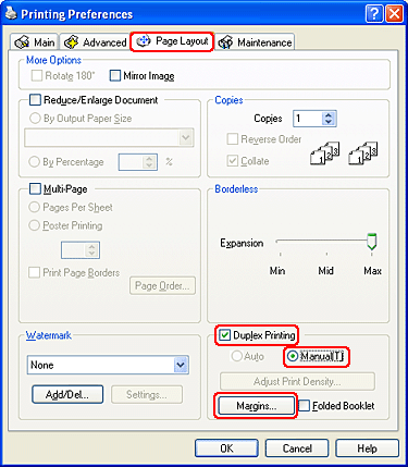 Klik på fanen Page Layout (Sidelayout), vælg Duplex Printing (Dupleksudskrivning) og vælg derefter knappen Manual (Manuel).