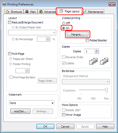 Klik på fanen Page Layout (Sidelayout), og vælg derefter On (Til) under 2-sided printing (2-sidet udskrivning).