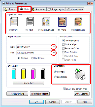 Klik på fanen Main (Hovedmenu), og vælg derefter en af følgende indstillinger for Quality Option (Kvalitetsindstillinger):