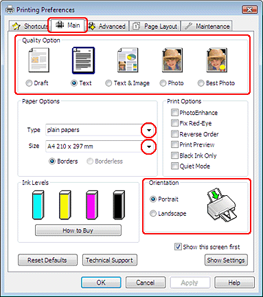 Klik på fanen Main (Hovedmenu), og vælg derefter en af følgende indstillinger for Quality Option (Kvalitetsindstillinger):