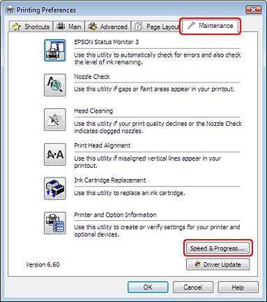 Du kan øge udskrivningshastigheden ved at vælge bestemte indstillinger i vinduet Speed & Progress (Hastighed og status). Klik på knappen Speed & Progress (Hastighed og status) i printerdriverens vindue Maintenance (Vedligeholdelse).