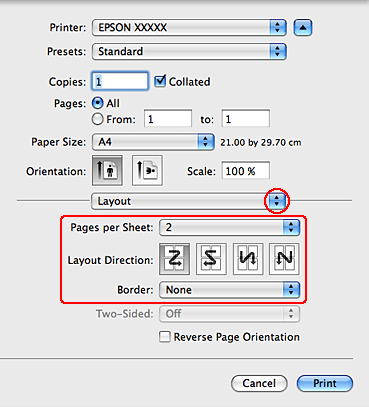 Klik på fanen Page Layout (Sidelayout), vælg Multi-Page (Flere sider), og vælg derefter Pages Per Sheet (Sider pr. ark).