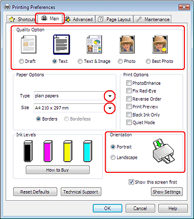 Klik på fanen Main (Hovedmenu), og vælg derefter en af følgende indstillinger for Quality Option (Kvalitetsindstillinger):