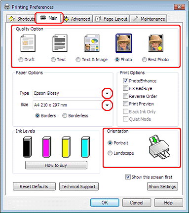 Klik på fanen Main (Hovedmenu), og vælg derefter en af følgende indstillinger for Quality Option (Kvalitetsindstillinger):