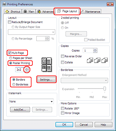 Klicken Sie auf die Registerkarte Page Layout (Seitenlayout), wählen Sie Multi-Page und dann Posterdruck. Klicken Sie auf den Auf- oder Abwärtspfeil und wählen Sie 2x1, 2x2, 3x3 oder 4x4 aus.