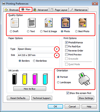 Klicken Sie auf die Registerkarte Main (Haupteinstellungen), und wählen Sie anschließend eine der folgenden Quality Option (Qualitätsoption)-Einstellungen aus: