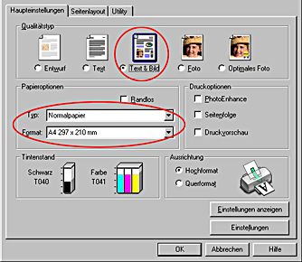 Klicken Sie auf die Registerkarte Haupteinstellungen und wählen Sie unter Papieroptionen die Einstellungen Normalpapier und A4 sowie unter Qualitätstyp die Einstellung Text & Bild.